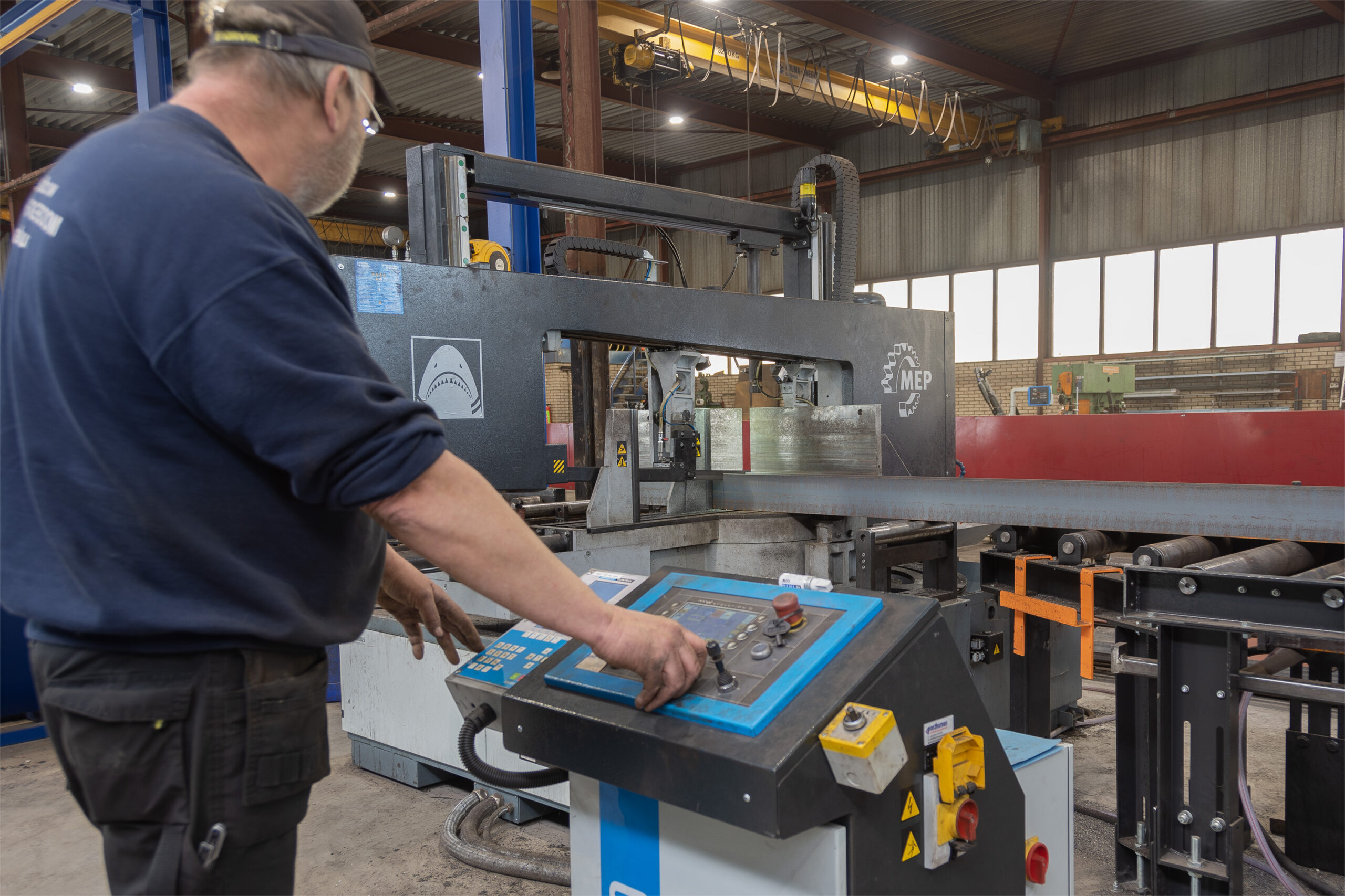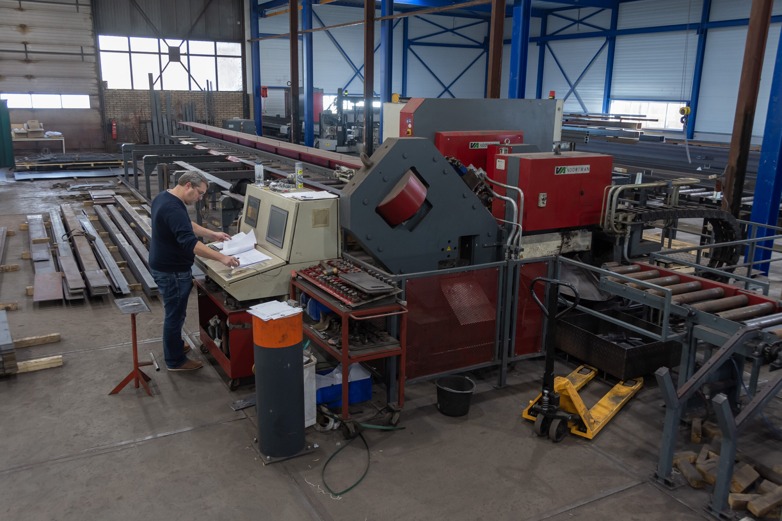 Het staal wordt op lengte gezaagd, gaten worden computergestuurd op de juiste plekken geboord. Kop- en voetplaten worden met een CNC pons/knipstraat geproduceerd, waarna alle losse elementen in elkaar gelast worden.